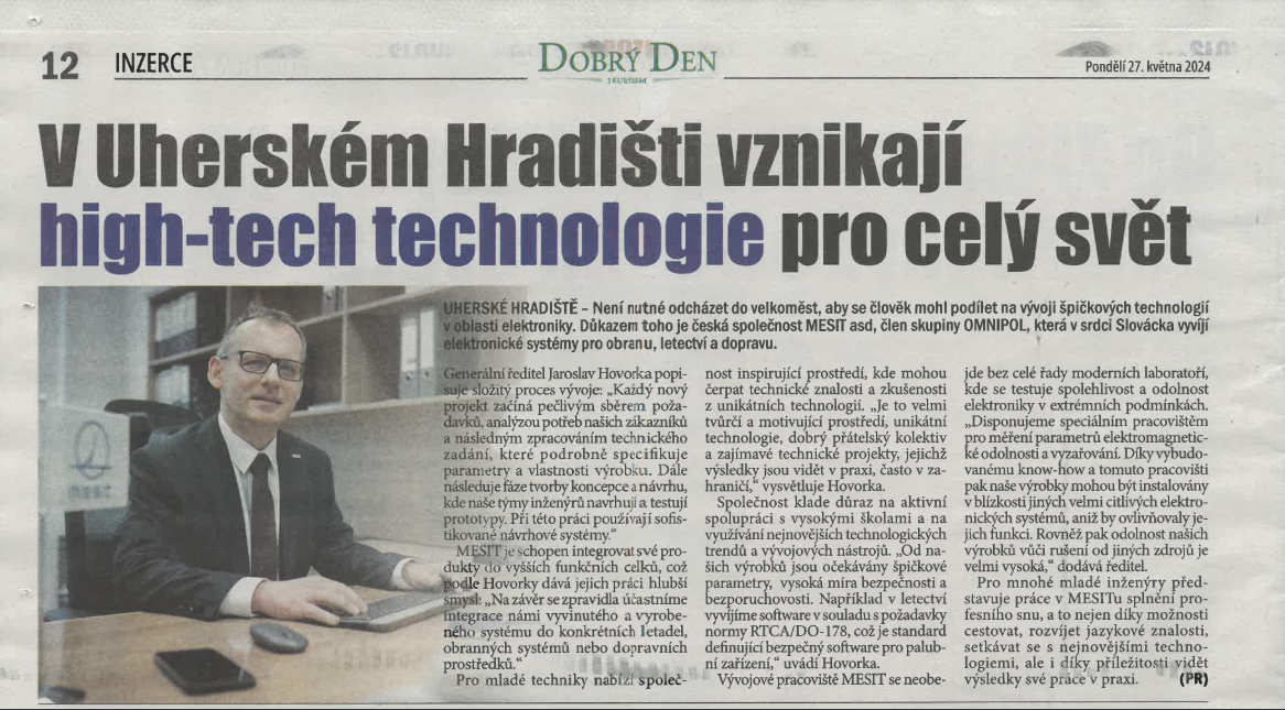 MESIT dostal svůj prostor v dnešním vydání Dobrý den s kurýrem a čtenáři tak mají možnost nahlédnout do fungování R&D týmu, který se věnuje vývoji elektronických systémů pro obranný, letecký a dopravní průmysl.