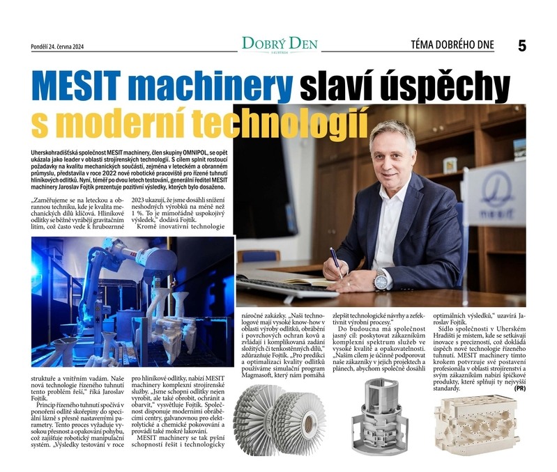 Již téměř dva roky testuje MESIT na svém robotickém pracovišti technologii řízeného tuhnutí hliníkových odlitků. Výsledky shrnul generální ředitel MESIT machinery Jaroslav Fojtík pro týdeník Dobrý den s kurýrem.