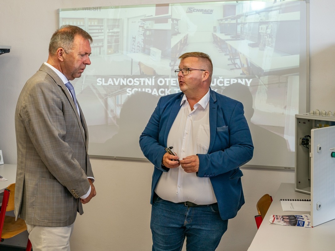 Mezi hosty nechyběli významní představitelé regionu i firmy Schrack Technik a firmy MESIT, člena skupiny OMNIPOL. Společně jsme přestřihli pásku a prohlédli si učebnu, která nabízí moderní vybavení včetně montážních stolů na míru a instalačních elektro prvků, které žáci budou využívat při své práci.